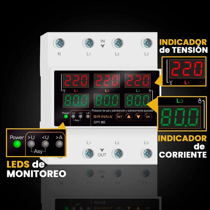 • El SPT-80 es un protector de subtensión, sobretensión y sobrecorriente trifásico